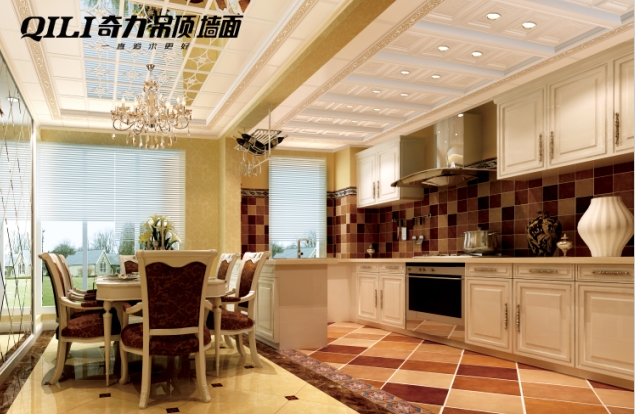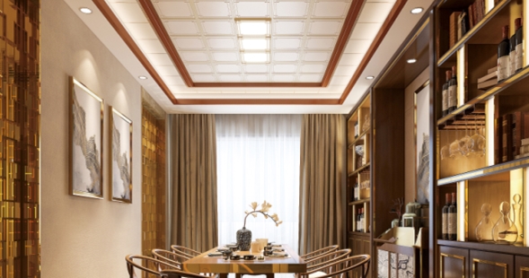 現代感十足的吊頂設計、扣板上簡潔的圖案,更是給人以視覺上的完美享受。這種極簡風格的餐廳設計更適合快節(jié)奏的生活。