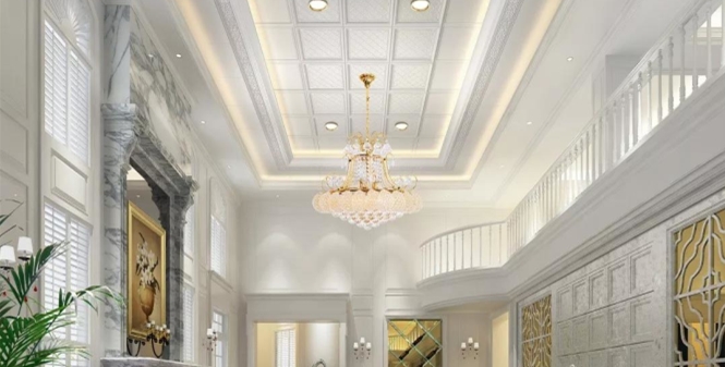 挑高客廳的空間大,如果頂部裝飾少,會顯得很空洞。可以在頂部裝上集成吊頂,來彰顯你的品味。注意在選擇集成吊頂的時候要和家中的整體風格進行匹配。