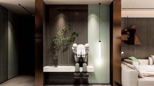 黑色波浪板在巖紋板與木紋板之間時尚過渡,這樣搭配出來的沙發(fā)背景墻,既擁有肌理的細節(jié),還給空間帶來了層次感與節(jié)奏感。