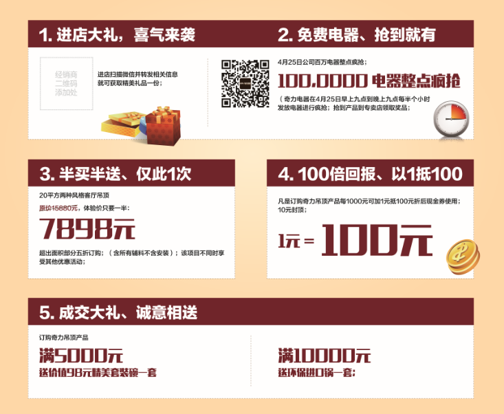 免費電器整點瘋搶。4月25日 09:00 -21:00 奇力吊頂微信公眾號定時發(fā)布電器免費禮券。搶到免費禮券即可到奇力專賣店兌換。活動當天進入 奇力吊頂 公眾號,發(fā)送 禮物 二字即可參與免費電器禮券活動。