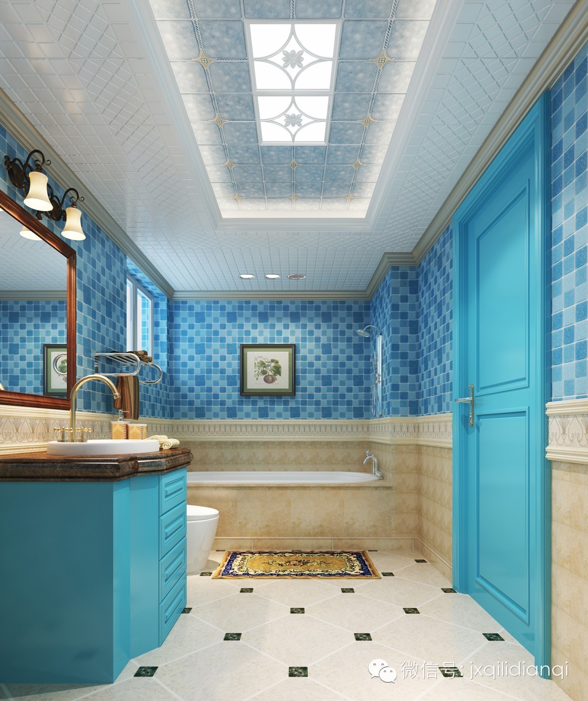 衛(wèi)浴間的設(shè)計也是非常清爽,在追求時尚個性的今天,人們對于家居的裝修上也非常講究獨(dú)特性。無論浴室是大是小,只要通過悉心的打扮,便可以凸顯另一番如畫的風(fēng)景。衛(wèi)浴間運(yùn)用清爽的藍(lán)色,黃色的浴缸外邊更是顯示了地中海的風(fēng)格,色調(diào)不一的藍(lán)色墻磚和頂上的淺藍(lán)吊頂遙相呼應(yīng),猶如藍(lán)色海洋,在這樣的藍(lán)色環(huán)境下泡澡,別有一番風(fēng)味。