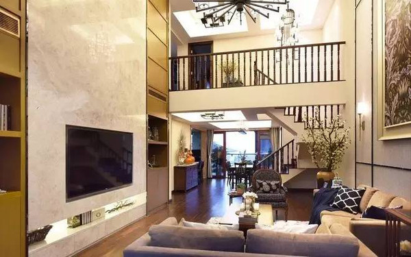 ③除此之外,挑空型客廳里的裝飾和配飾也是非常重要的一點(diǎn)了,可以嘗試在墻壁上掛上符合整體風(fēng)格的掛畫(huà),或者是根據(jù)設(shè)計(jì)師的建議安裝幾盞造型獨(dú)特的壁燈,這些裝飾一烘托,整個(gè)客廳就更加大氣了。